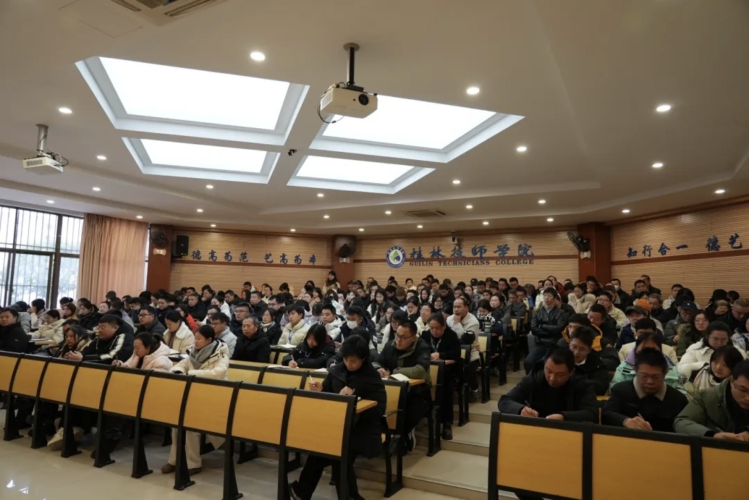 韩冰代表学院党委及领导班子向全体教职工一年来的辛勤付出表示感谢,并从四个方面总结部署学院工作:一是肯定年度成绩,表扬先进,强调要持续聚焦立德树人,巩固工作成果;二是要深入贯彻上级精神,对接地方产业需求,优化专业设置、深化融合改革,不断提升育人质量与学院品牌影响力,主动服务桂林发展大局;三是重视12345政务热线等渠道反映的问题,切实做好整改与反馈,加强政策宣传,营造良好育人环境;四是对寒假工作提出希望,提醒全体教职工牢记安全第一、严守纪律、廉洁自律,合理安排休息与学习,陪伴家人、谋划未来,同时要求值班人员认真履职,确保校园平安稳定。韩冰表示,新的一年,学院党委将持续强化党建引领,推动党建与业务深度融合,携手全体教职工共同谱写学院发展新篇章。