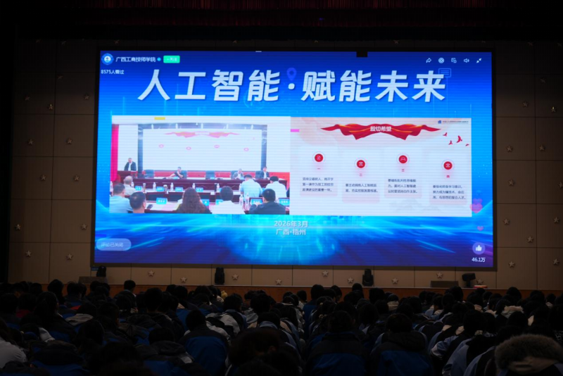 春意盎然,万象更新。根据广西壮族自治区人力资源和社会保障厅《关于组织开展2026年春季学期开学第一课活动的通知》精神,学院院长李金河参加“开学第一课”现场活动,学院近1300名师生在大礼堂集中观看广西技工院校2026年春季学期开学第一课——“人工智能・赋能未来”主题线上直播,共启新程。