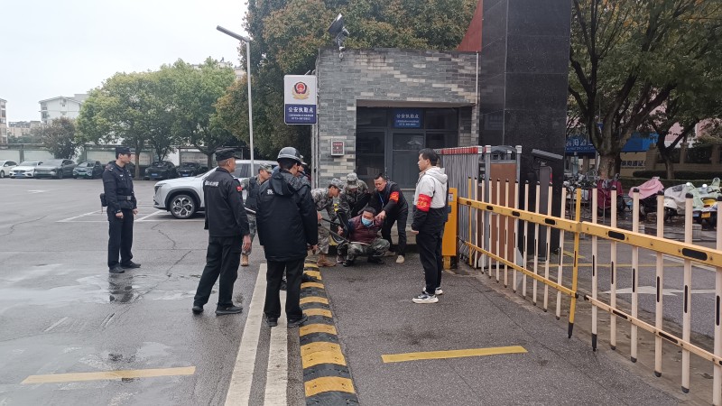 本次演练以“校门突发极端事件”为模拟场景,重点检验应急队伍快速响应、协同作战及规范处置能力。“可疑人员”持利器试图强行闯入,演练人员在学院校门处迅速集结到位,对其进行先期处置与拦截。