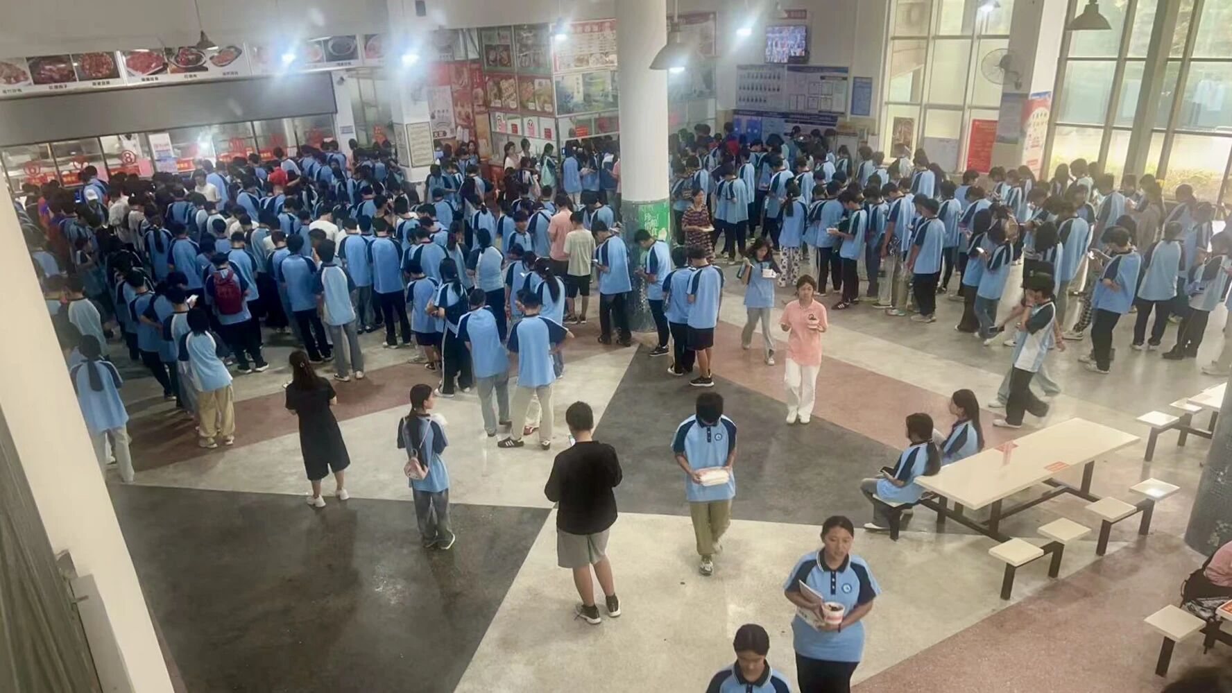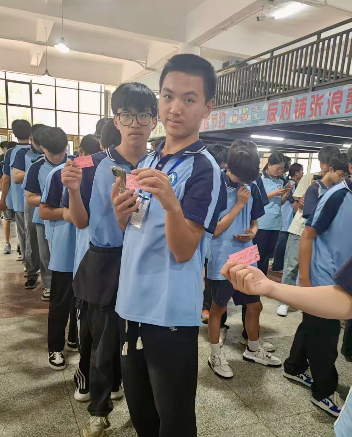 活动当天的食堂,更是热闹又温馨。饭菜的香气裹着同学们的欢笑声,成了最动听的节日背景音。大家拿着餐券,安安静静地排着队取餐;坐同桌的小伙伴们,你一言我一语地分享着家乡的中秋习俗 —— 有的说家里会摆月饼塔,有的说国庆要跟家人去逛公园,空气中满是团圆的甜意。