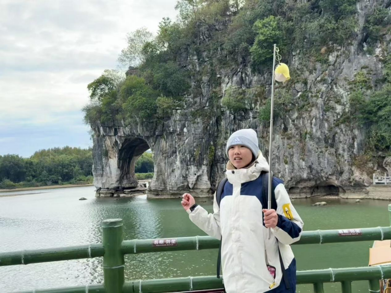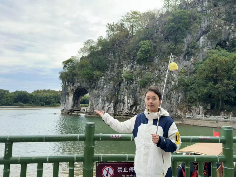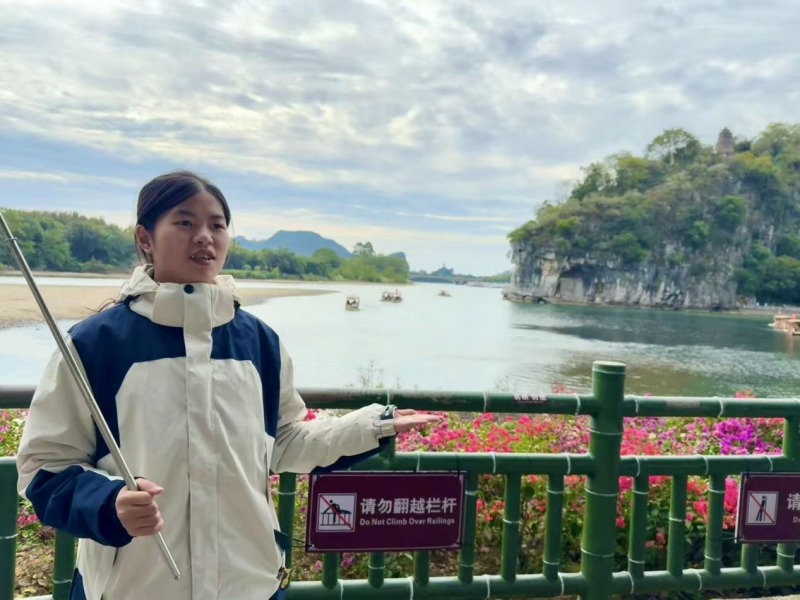 告别传统课堂的理论讲授,同学们带着提前梳理的景点串联、反复打磨的导游词,走进桂林的标志性景区。在两江四湖﹒象山景区,同学们以象鼻山的“水月奇景”为切入点,将喀斯特地貌知识与桂林山水传说相结合,用生动的语言勾勒出“山清、水秀、洞奇、石美”的画卷。