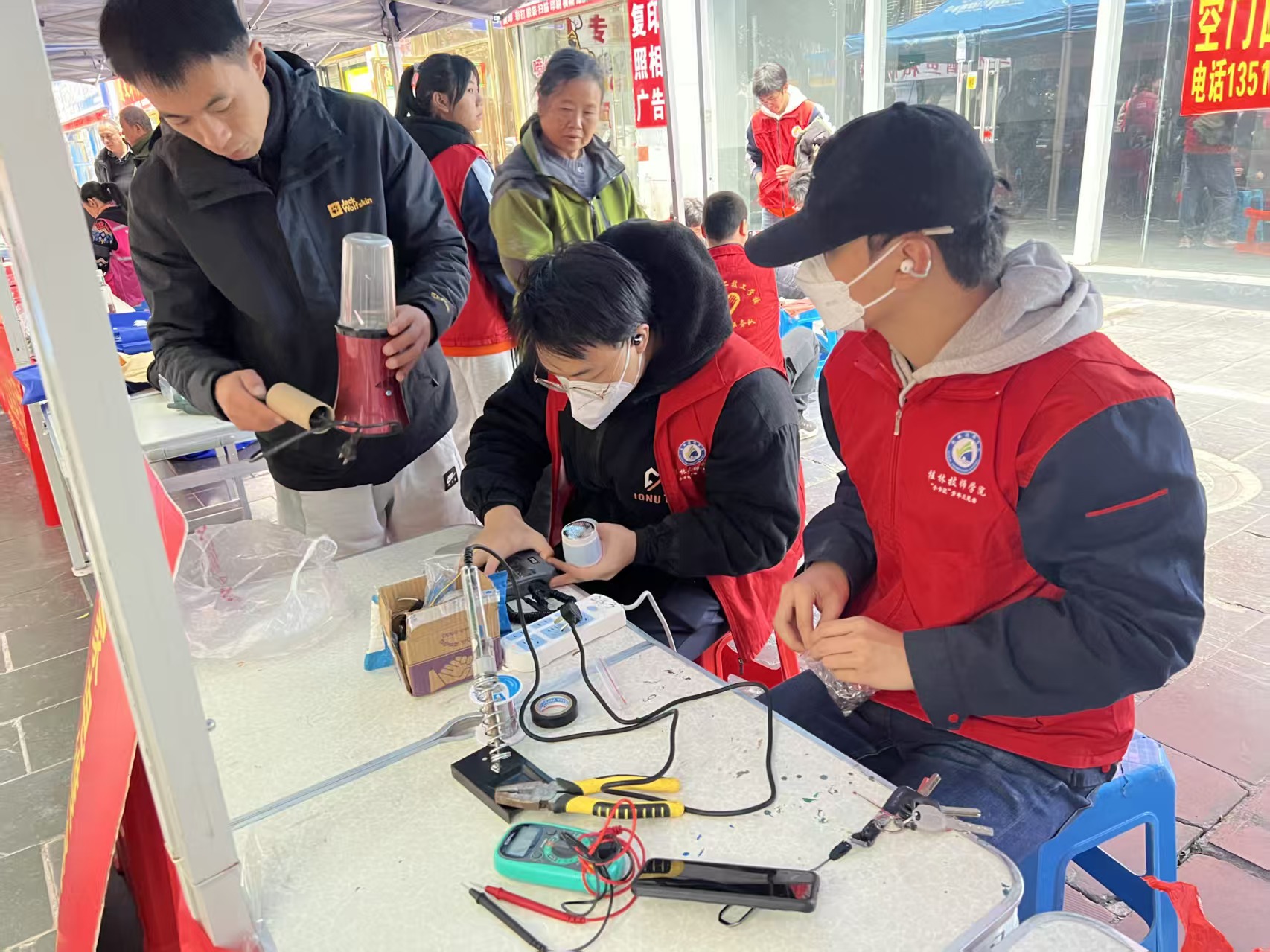 学院坚持党建带团建工作机制,充分发挥专业优势,派出2名党员教师,2名团委老师带领的专业团队,组织美容保健专业4名学生为居民提供肩颈按摩服务,机电一体化技术高级工班2名学生现场维修各类小家电。同学们在老师指导下,以娴熟技能服务社区居民,电风扇、热水壶等十余件小家电“重获新生”,专业按摩服务获居民连连称赞。